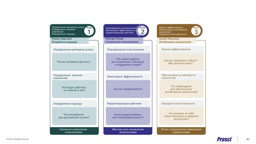 Модель ADKAR обеспечивает успешные изменения на индивидуальном уровне, а 3-фазный процесс Prosci масштабирует этот эффект на всю организацию. Он предоставляет структурированную основу для проведения трансформации на уровне предприятия.
