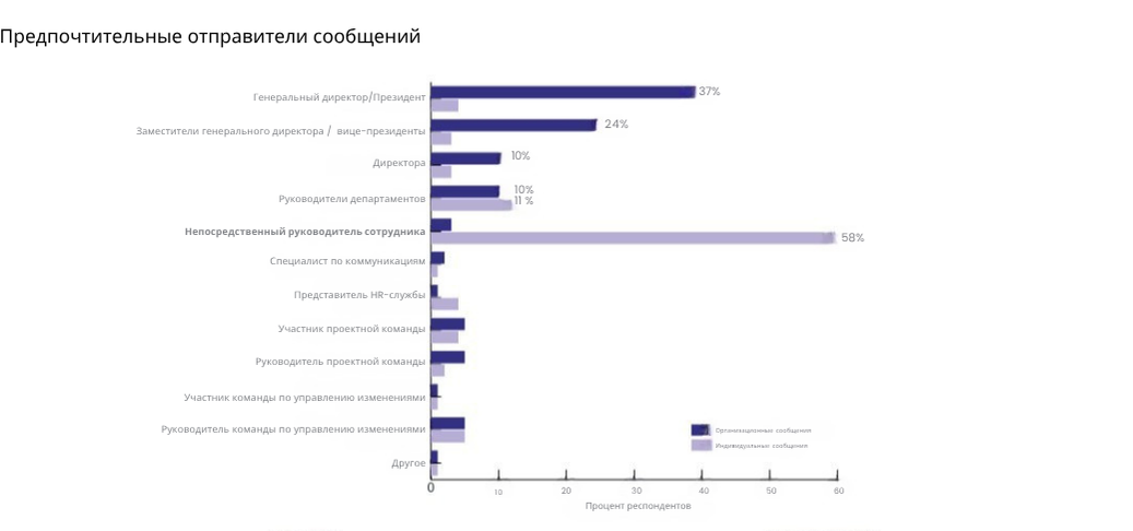 При коммуникации обновлений по изменениям также важно учитывать, кто их передаёт. Исследования Prosci показывают, что люди предпочитают получать определённые сообщения об изменениях от конкретных ролей в компании.