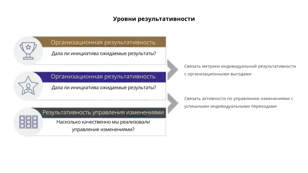 Фаза 3 – Закрепление результатов – на этом этапе организация измеряет уровень принятия, собирает обратную связь и предпринимает шаги, чтобы изменения закрепились